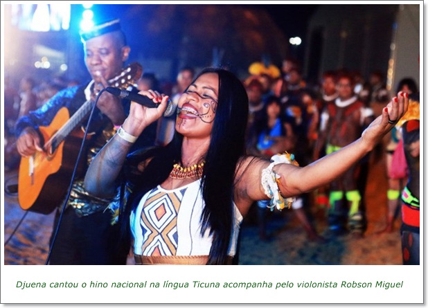 Todo mundo se emocionou quando a cantora Djuena interpretou o hino nacional na língua Ticuna, acompanha pelo violonista Robson Miguel. A segunda metade do hino foi cantada também em português. Outro momento emocionante foi quando os guerreiros Terena do Mato Grosso do Sul entraram na arena segurando tochas de fogo. Depois de dançarem ao redor de uma fogueira, a pira dos Jogos foi acesa.